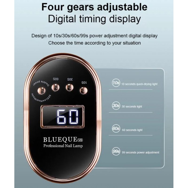 Η επαγγελματική λάμπα νυχιών Blueque V8 περιέχει 42 led, στρατηγικά τοποθετημένα ώστε να μην υπάρχουν «νεκρές ζώνες» εξασφαλίζοντας τη μέγιστη απόδοση, χωρίς απώλειες στον πολυμερισμό.
